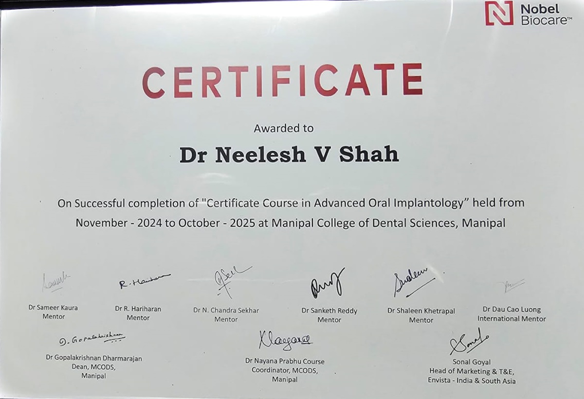 DR. NEELESH SHAH is a MASTER IN DENTAL SURGERY (M.D.S) in the field of Orthodontics and Dentofacial Orthopaedics from Manipal University.